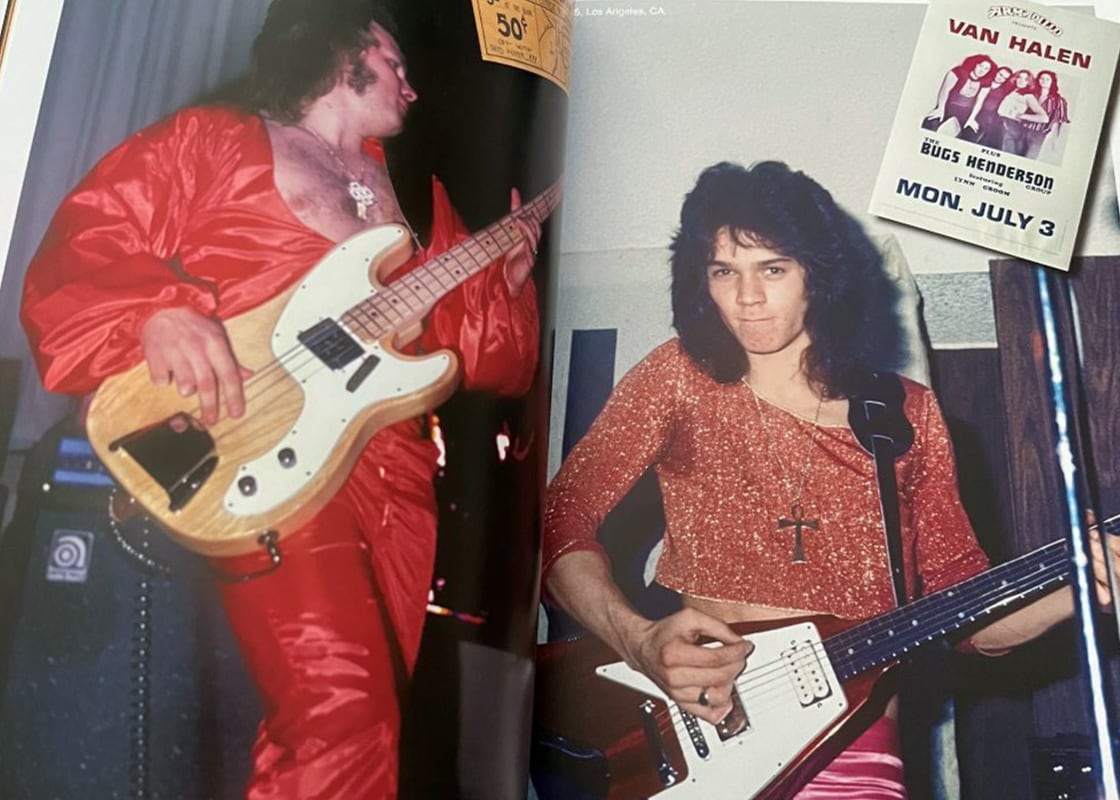 There are approximately 400 images, more than half of those being live shots from five decades of tap ‘n’ shred guitar, the rest being rare memorabilia, magazine ads, 45 sleeves, promo items, ticket stubs, passes… you name it, with Sam solo and Dave solo covered as well, the first time in a Van Halen coffee table book.